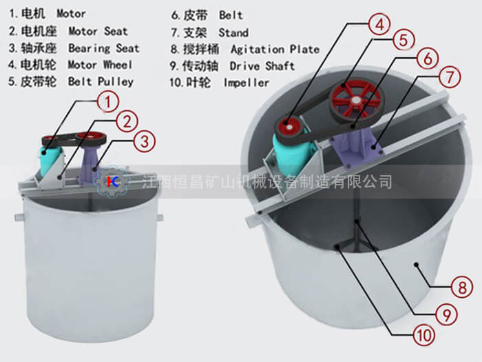 礦用攪拌桶由電機、電機座、軸承座、電機輪、皮帶輪、皮帶、支架、攪拌桶、傳動軸、葉輪等部件組成。