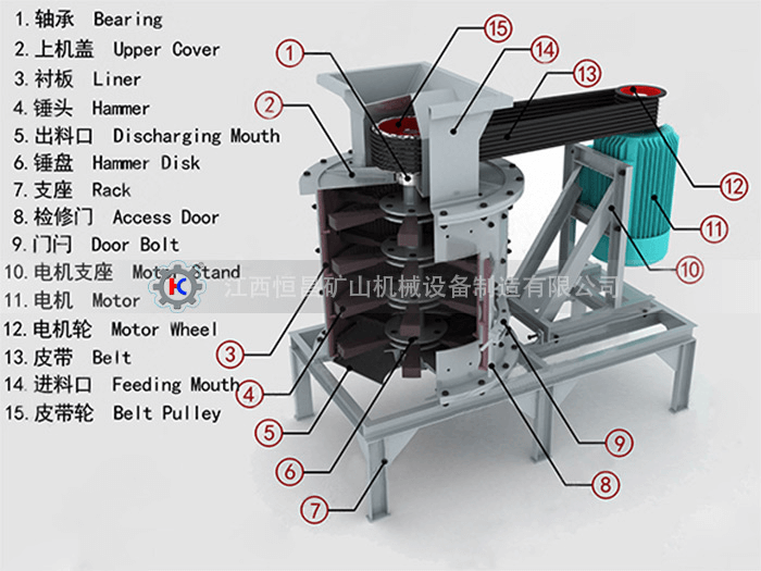 立式制砂機主要由傳動裝置、主軸、筒體、襯板、錘頭、上蓋及底座等部分組成。
