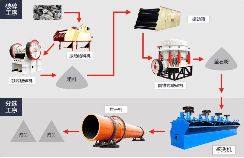 螢石礦的選礦工藝需根據(jù)礦石性質(zhì)以及客戶要求精礦品位等多方面的因素制定,一般要求冶金級螢石精礦的選礦只需經(jīng)過手選,重選即可,對于酸級化工行業(yè)用螢石精礦粉的制取需要采用浮選的方法獲得,該工藝通過手選,重選,浮選聯(lián)合工藝處理螢石礦,具有較強(qiáng)的代表性
